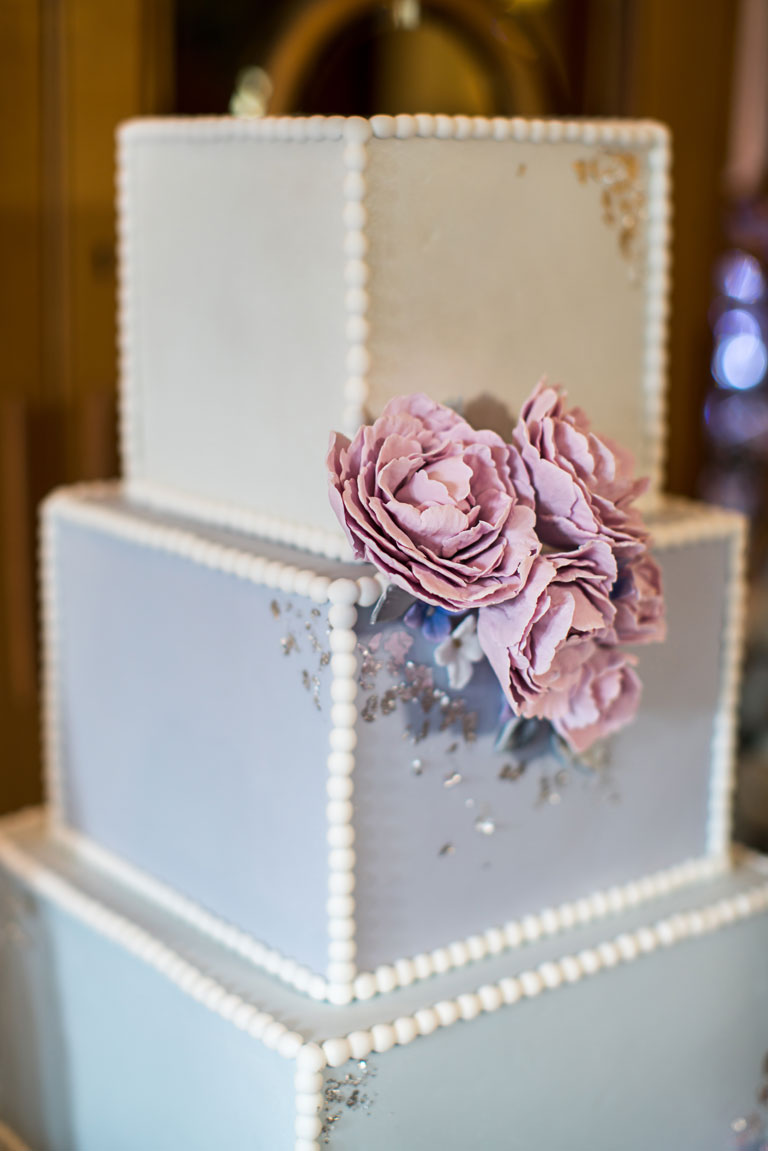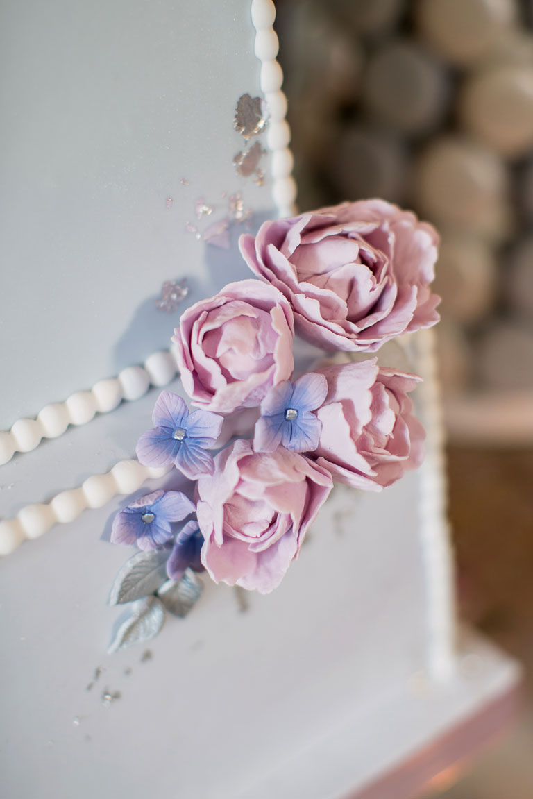 On either side of the main cake we designed two single tier cakes, one in a dark navy to contrast the lighter pastel shades and the other in ivory and pink with a unique rough crystallised finish.