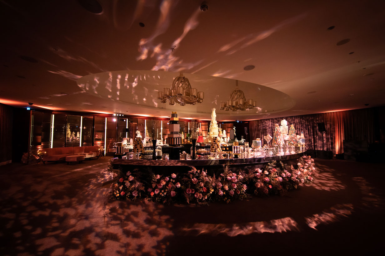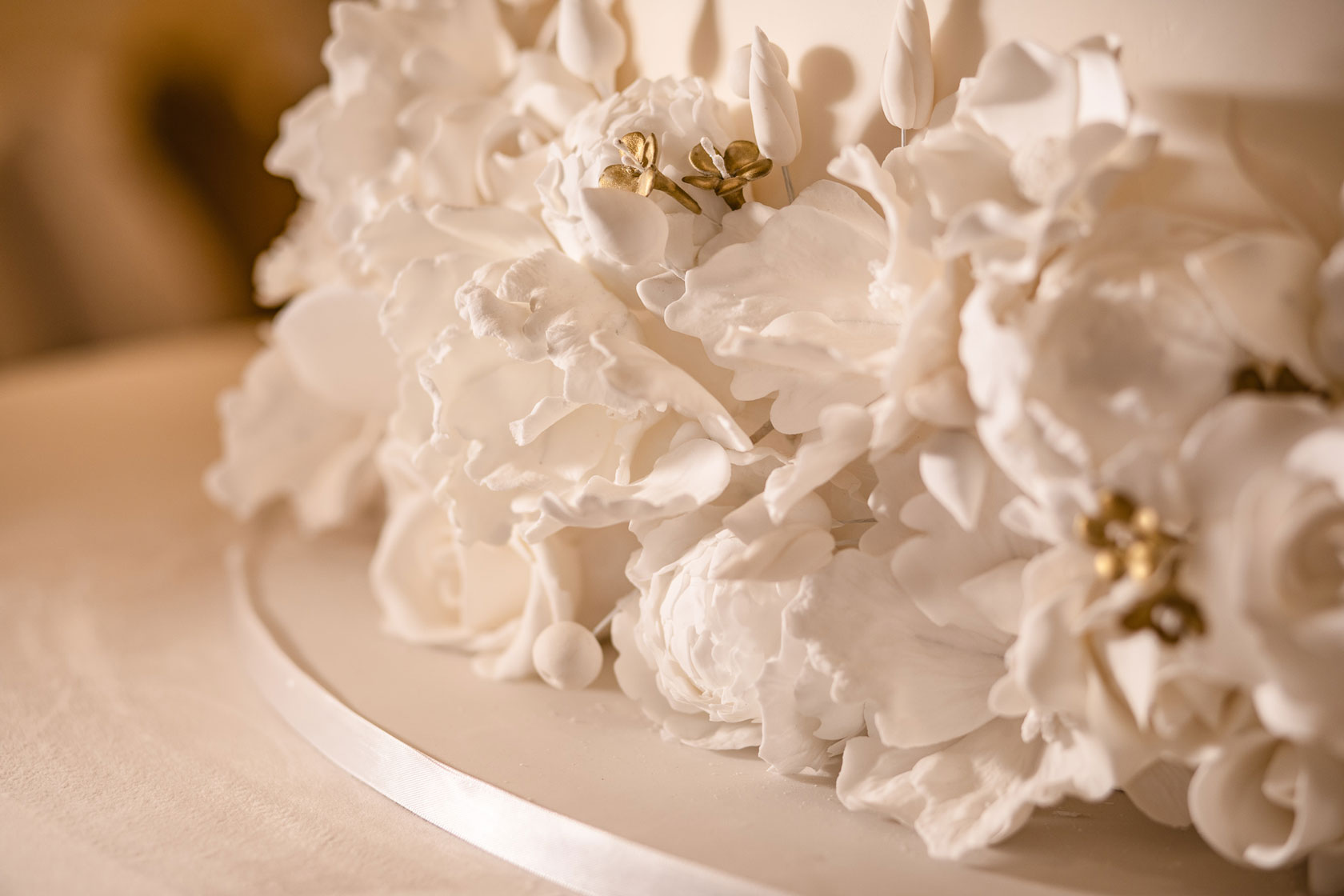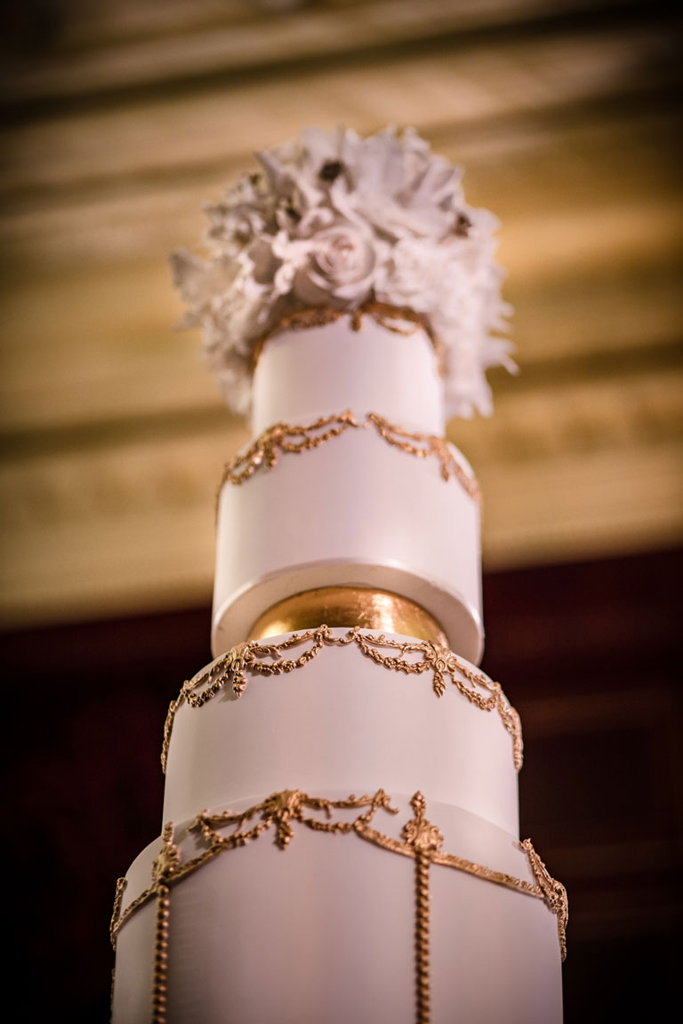 Whatever the angle, the reflection of the 24k edible gold leaf tiers were there for all to see. Carefully hand-piped in gold, the family crest stood proud alongside the Bride & Groom initials.