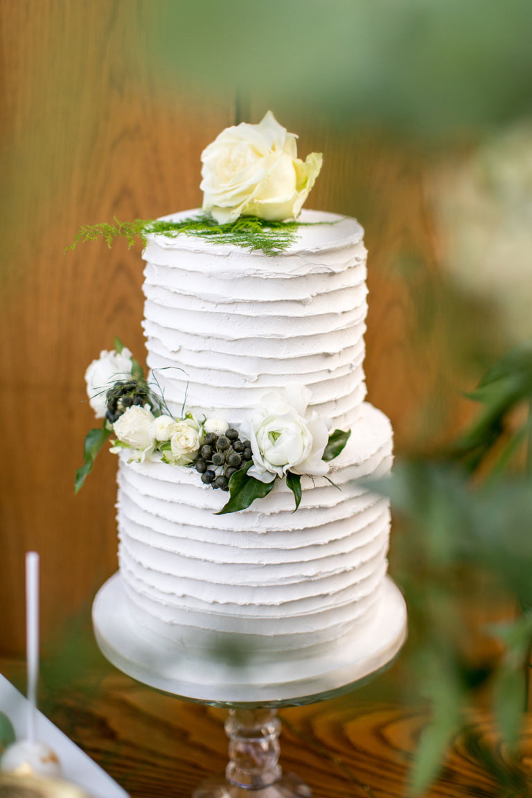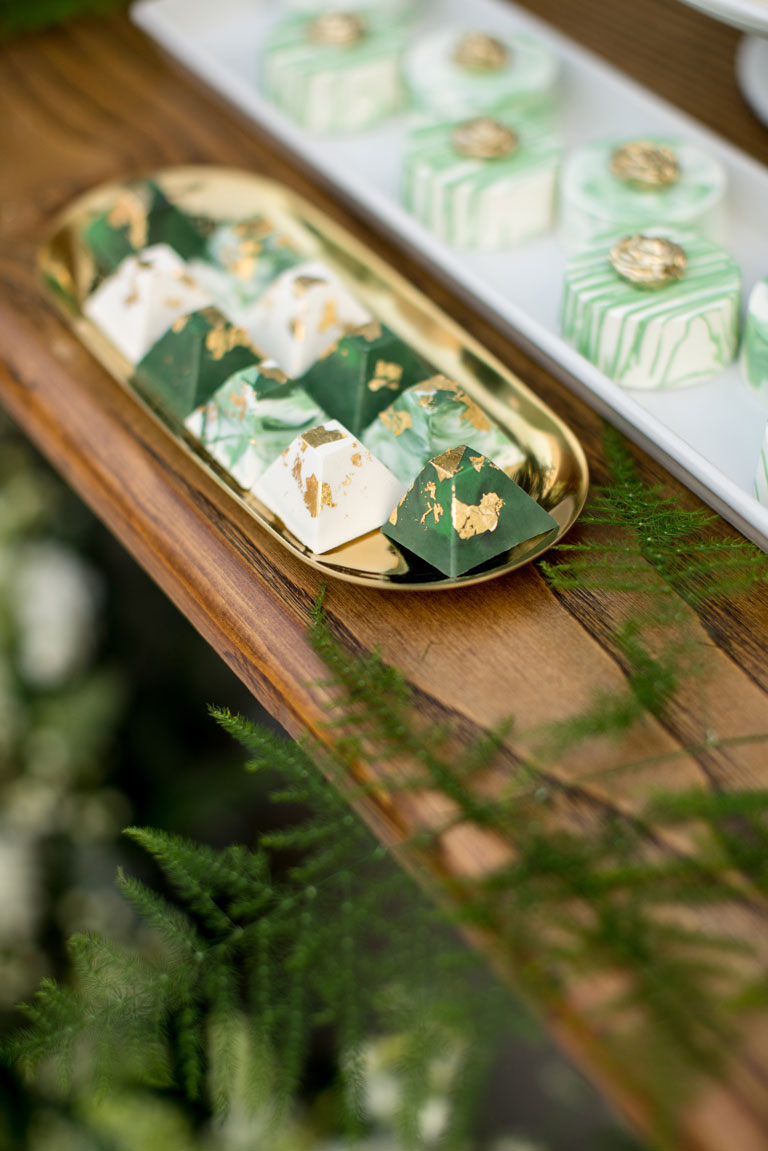 The colour scheme we used, greens, whites and golds was to reflect the fresh wild countryside feel at a venue known for growing all of it's own seasonal ingredients. Above, our two-tier buttercream cakes - embellished with real florals - sit alongside our marble chocolates, adorned with gold leaf.