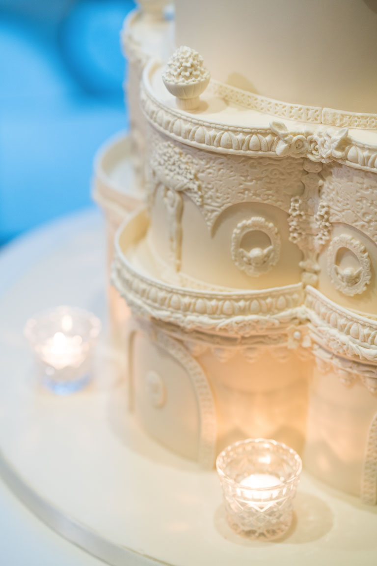 This classic, ivory showpiece was based on a traditional tiered column cake dressed with arched doorways and decorative balconies. This cake was designed for the classic bride that likes timeless concepts and regal features.