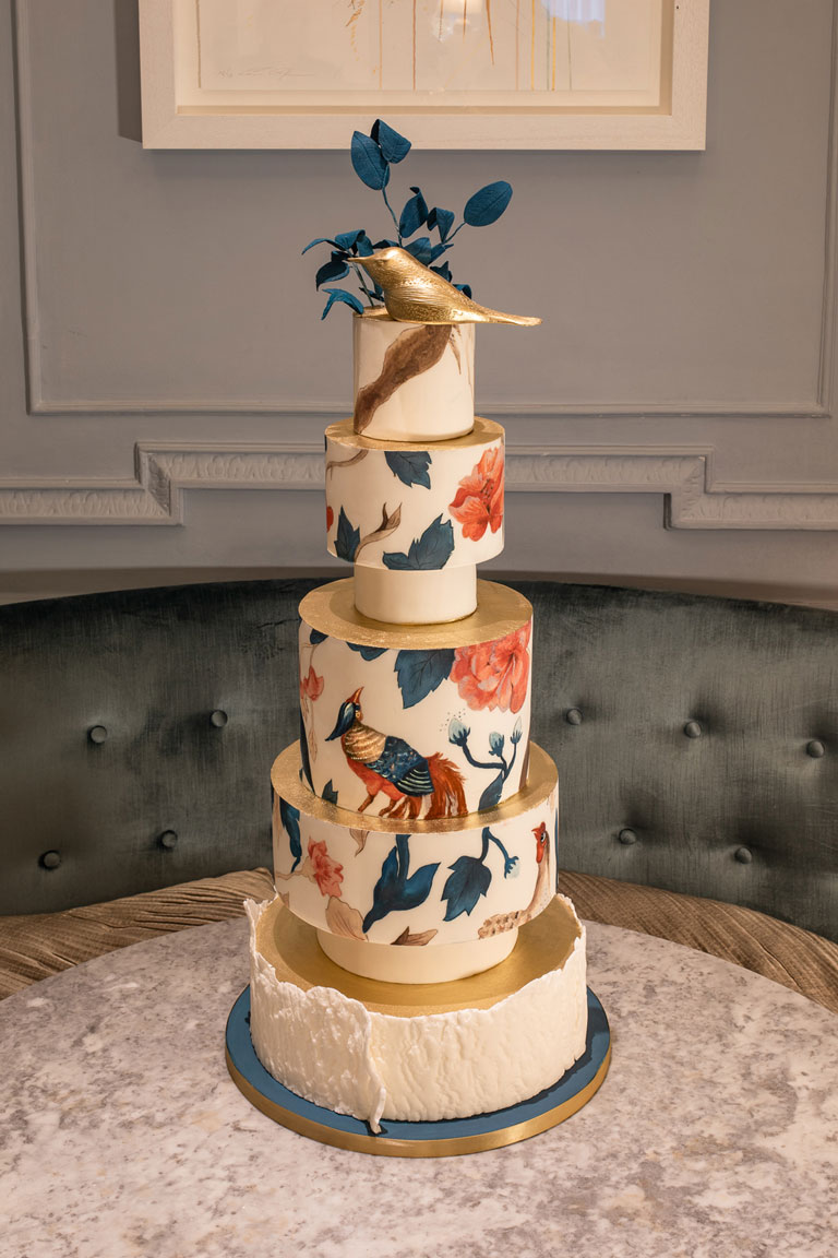 Hand drawn and intricately painted, this exquisite 5-tier centrepiece with separators also boasted a hand moulted gold painted bird which perched on the top tier.